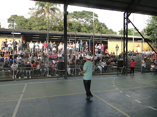 Acreditem se quiserem (vejam as fotos), mas este encontro da Poesia com a escola aconteceu na quadra poliesportiva, onde acontece as aulas de Educação física, e que mais parecia um jogo de futebol.